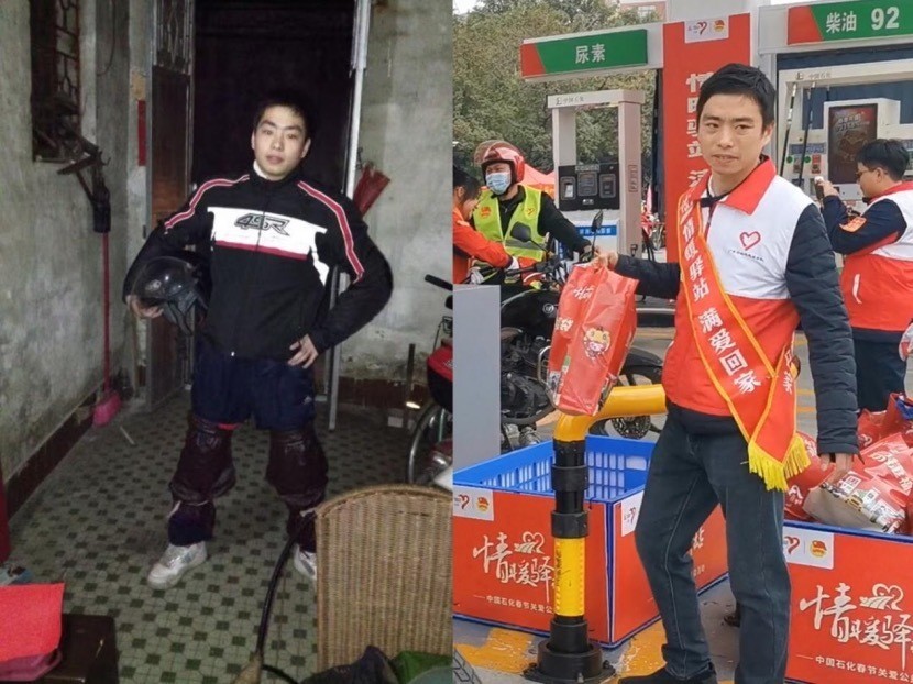 左图为王富忠2015年第一次开摩托车返回家乡(采访对象供图),右图为王富忠2025年在广东佛山龙山加能站做志愿者服务。(魏晓航 摄)“我曾经也是返乡摩骑的一员,现在我开车回家了。”王富忠说。“印象最深的是2018年那次,我们晚上经过广州下了雨,我的摩托车坏了,那时候摔了一跤,行李也撒了一地,刚好在不远处就有志愿者出来帮我把行李绑好,还把摩托车推到加油站。”